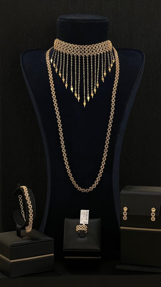 طقم ذهب عيار 21 كبير وفخم بتصميم خليجي جذاب ومميز بوزن 56.7 جرام .. طقم ذهب صُمم لأجلك، مما يجعلك أمرأة عصرية كاملة البهاء، لتتزيّن ملامح جسدك بطابع الجمال الأنثوي الساحر، اجعلي من هذه القطع لغة لجمالك.